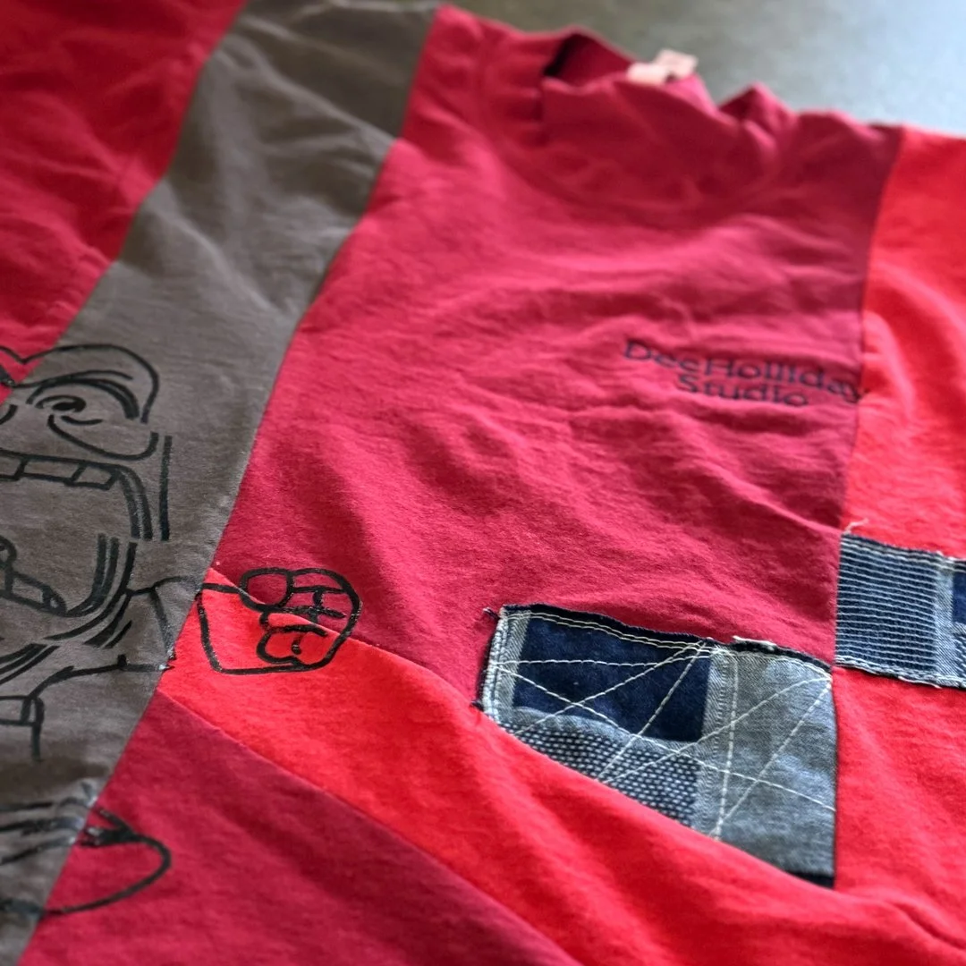 I decided on an upcycled mixed media look. I intentionally cut shards of three different shirts and patched denim fabric to form a full shirt and serged them together with no logical pattern to the viewer, in much the same way that anger is connected to chaos in the world. The Anger character was screen printed on the shirt with an intentional "glitch" in the design to represent the fierce emotion. The quote from the movie gave the custom shirt personality, and DeeHolliday Studios was embroidered on the left chest to conclude the branding.
