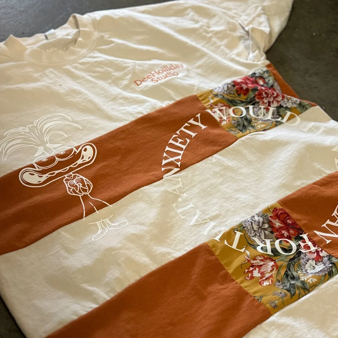 Finished the product using mixed media. Serged two separate fabrics together to mimic the look of Anxiety's orange and white striped turtleneck. Allowed it to be oversize to fit with the trend. The floral patch added more life and allowed for a feminine touch. The screen printed image of the character and famous circular quote from the movie fit the theme. For branding, a simple DeeHolliday Studios was embroidered on the top right chest.